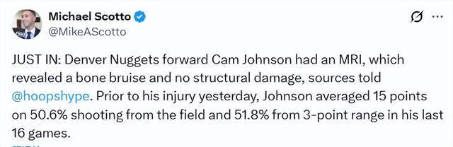 北京时间12月25日,掘金队前锋约翰逊在昨日遭遇右膝伤病后,迎来了好消息。据名记Scotto报道,约翰逊的膝盖核磁共振检查结果显示为骨挫伤,并无结构性损伤。